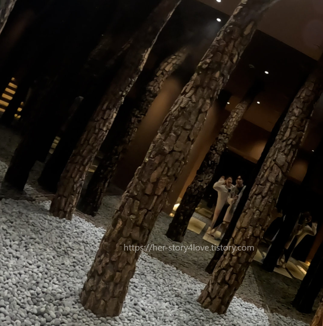 카페에 들어서면 보이는 거울벽 + 나무기둥 공간이 너무 맘에 들었던 나.